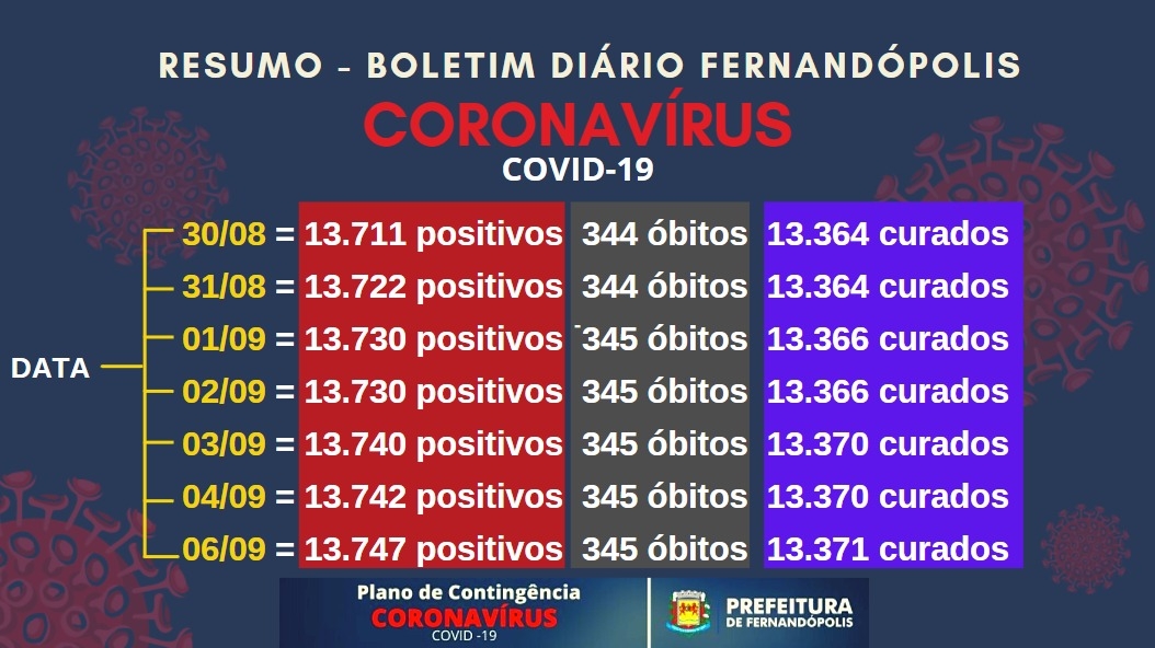 Foram registrados nas últimas 24 horas mais 4 novos casos positivos e 25 suspeitos. O número de óbitos são 347, desde o início da pandemia. Os pacientes recuperados somam 347, desde o início da pandemia.