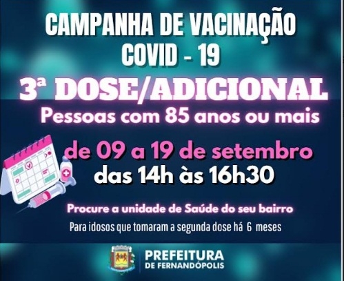 A partir de quinta-feira, 9, Fernandópolis começa a cumprir o calendário de vacinação com a dose de reforços em idosos com idade acima de 85 anos.