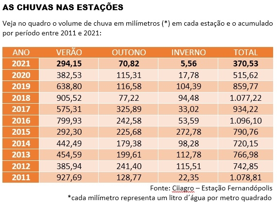 Juntas, as três estações, acumularam 370,6 mm. No mesmo período do ano passado, as três estações acumularam 515,6 mm, e que não está entre os períodos mais chuvosos registrados na região.