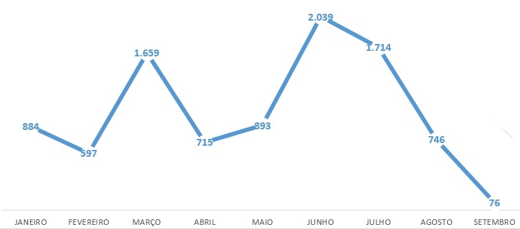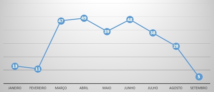 Entre março e agosto, foram registrados 7.776 casos positivos de Covid-19 e 249 óbitos. Depois da subida exponencial dos números, em setembro, o efeito da vacinação trouxe o alívio. Na comparação com agosto, a queda no registro de casos chegou 89,8%, caiu de 746 para 76 até quinta-feira. O registro de óbitos despencou de 28 para cinco casos.