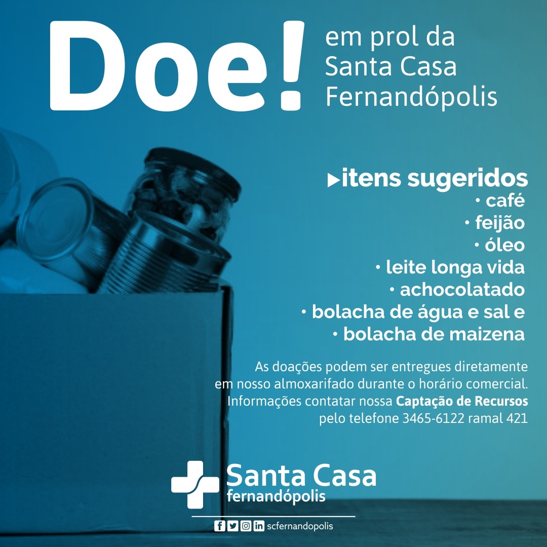 A Santa Casa de Fernandópolis divulgou apelo esta semana para a população da cidade e região para doação de alimentos não perecíveis ao hospital. A campanha busca abastecer o serviço que disponibiliza 700 refeições por dia aos pacientes.