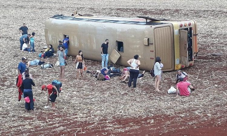 De acordo com a Polícia Rodoviária Federal, as informações preliminares indicam que o ônibus de compristas seguia de Foz do Iguaçu, no oeste do Paraná, retornando para São Paulo (SP), quando um veículo, provavelmente um caminhão na contramão fez uma ultrapassagem forçada e chegou a resvalar no ônibus que, para evitar uma colisão frontal, saiu da pista e tombou além do acostamento. O veículo ficou completamente fora da rodovia, em uma área de plantação e, por isso, não houve interdição.