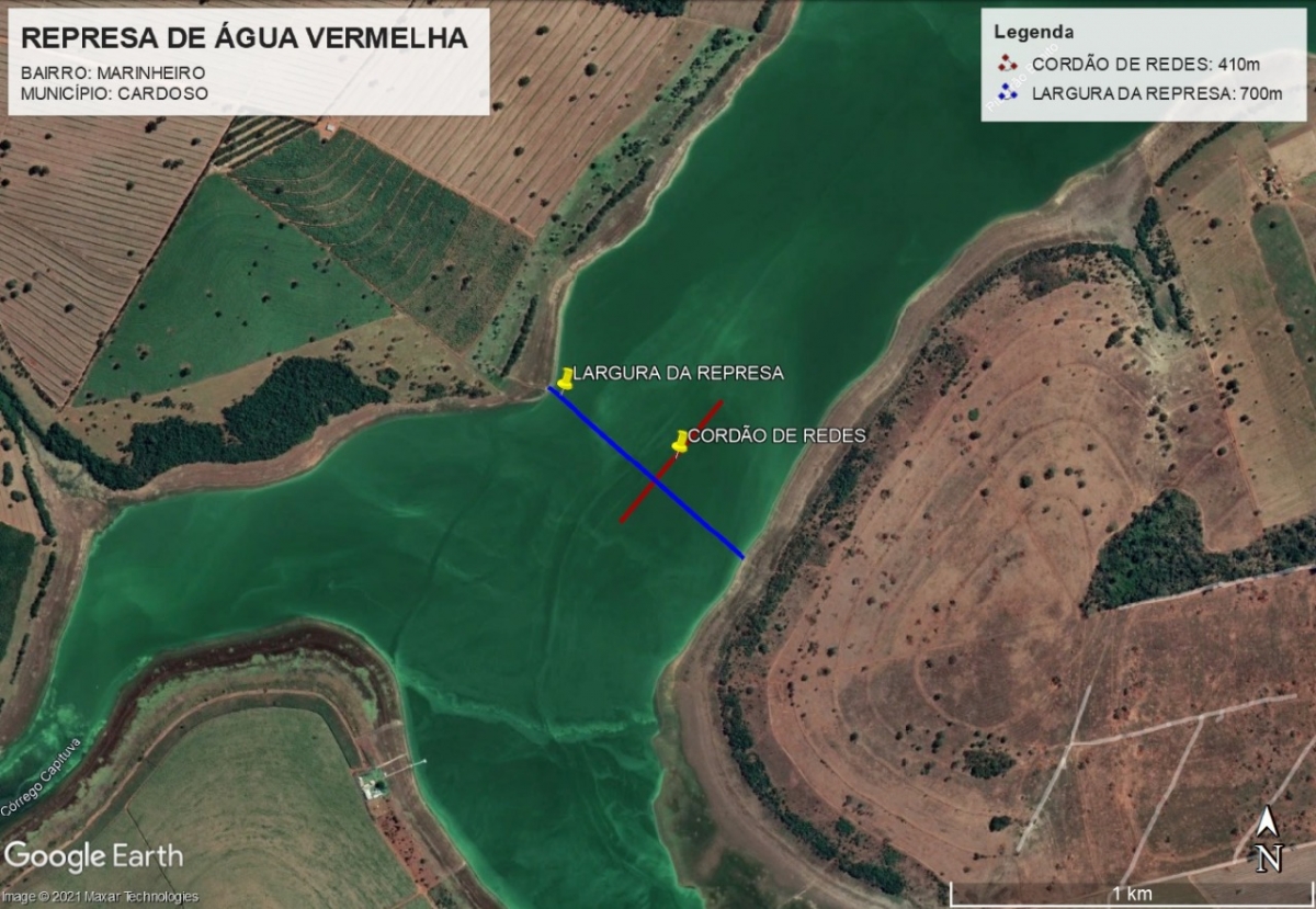 Durante policiamento ambiental ao realizar fiscalização de pesca embarcada na cidade de Cardoso, os policiais abordaram uma embarcação de um pescador profissional que havia armado um cordão de redes, ultrapassando 1/3 do ambiente aquático, infringindo o disposto no artigo 2º, inciso I, letra “b” da Instrução IBAMA 26/09.