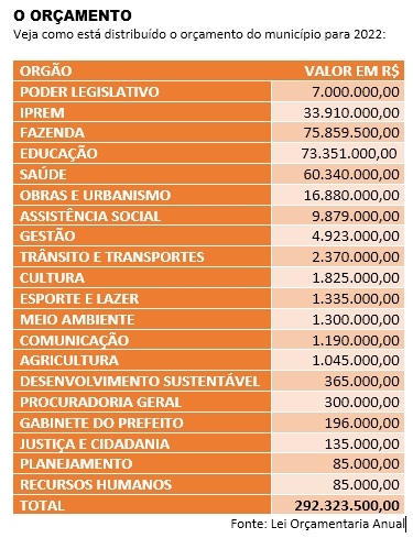 De acordo com a peça orçamentaria (veja quadro), Fazenda, Educação e Saúde vão movimentar 71% do bolo orçamentária (R$ 209,5 milhões). As demais pastas, Iprem e Legislativo dividem R$ 84 milhões. A despesa prevista com pessoal para o ano que vem é de R$ 150 milhões. O valor previsto para investimento é de R$ 13 milhões.