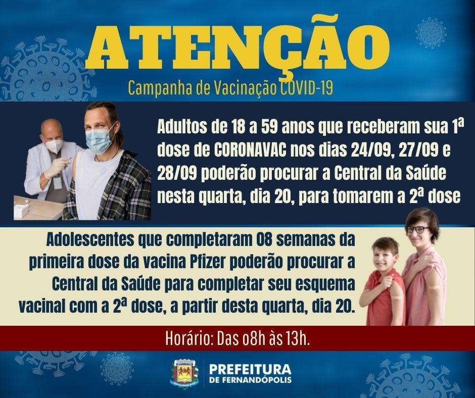 A prefeitura de Fernandópolis divulgou no final da tarde de ontem, 19, a antecipação de 8 semanas para 21 da segunda dose da vacina da Pfizer. A medida havia sido anunciada pelo governo estadual no início da semana e já está disponível em Fernandópolis em todas as Unidades de Saúde de segunda a sexta-feira das 09h às 13h.