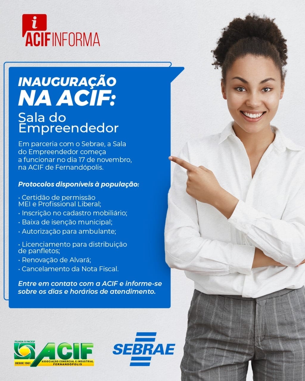 A ACIF – Associação Comercial e Industrial de Fernandópolis, inaugurou na manhã de hoje, 17, em parceria com o Sebrae a Sala do Empreendedor. O evento foi o primeiro da entidade sob o comando da nova presidente, a empresária Rosana Marques Nunes. Estiveram presentes na inauguração o prefeito, André Pessuto, o secretário de desenvolvimento Wagner Kamiyama e a equipe da regional do Sebrae.