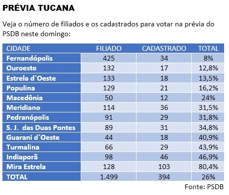 Com o acirramento da disputa entre os governadores João Doria, de São Paulo, e Eduardo Leite, do Rio Grande do Sul, os bastidores da prévia do PSDB, que vai definir neste domingo o candidato a Presidente da República, estão em ebulição. Apesar disso, a prévia não empolgou os filiados na região de Fernandópolis. Apenas 26% se cadastraram para votar pelo aplicativo. Em Fernandópolis, esse índice foi menor ainda, apenas 8%.