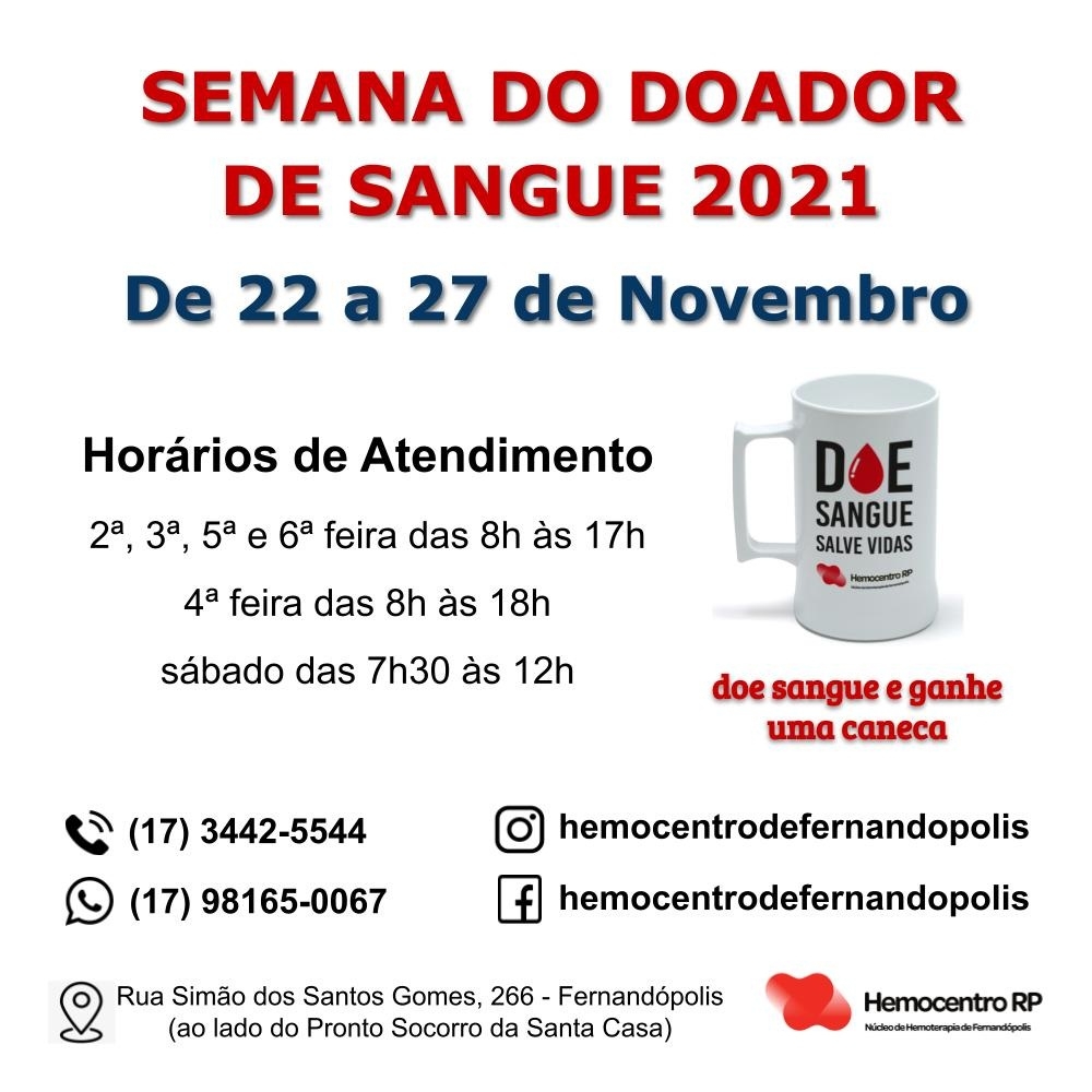 Novembro é uma época muito especial para a doação de sangue no Brasil. No dia 25 de novembro se celebra o Dia Nacional do Doador Voluntário de Sangue. O Hemocentro de Fernandópolis realiza a tradicional campanha da Semana do Doador de Sangue. Em meio a pandemia, o Hemocentro vem enfrentando sérias dificuldades em manter estoque de sangue.