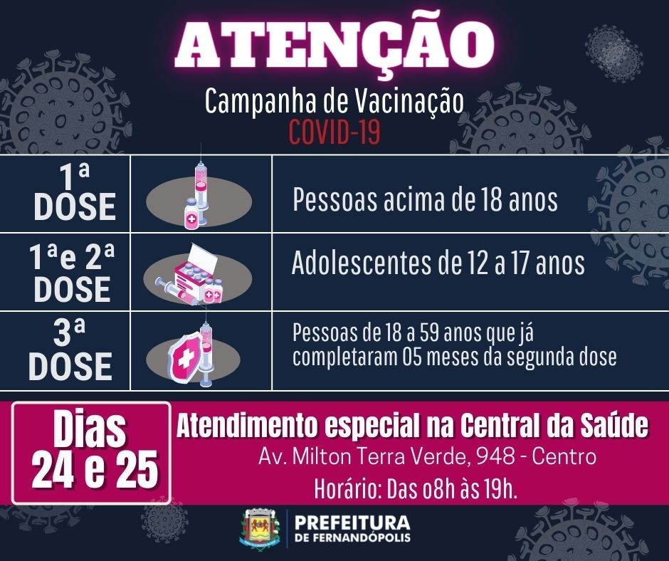 A secretaria de saúde de Fernandópolis anunciou a extensão no horário de vacinação contra Covid-19 na Central de Saúde amanhã, 24, e quinta-feira, 25. A unidade estenderá seus atendimentos até às 19h.
