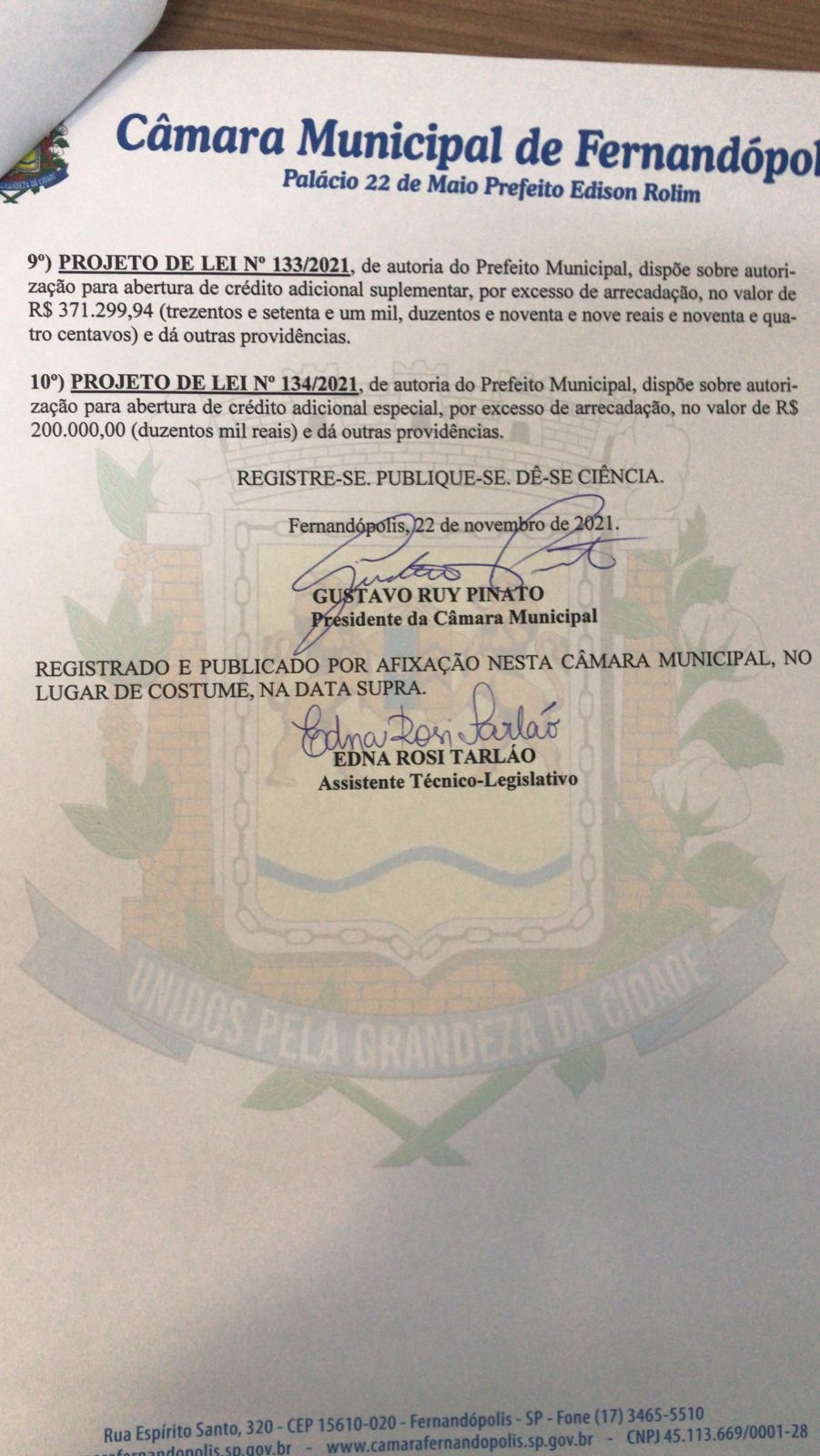 A Câmara de Fernandópolis realizará na noite desta terça-feira, 23, sessão extraordinária para votar vários projetos do Executivo e um do legislativo, que trata da correção do teto salarial do município para R$ 25 mil para corrigir distorção salarial que afeta principalmente os médicos de carreira do município. O tema, inclusive, foi objeto de discussão durante audiência pública realizada no Palácio 22 de Maio Prefeito Edison Rolim na primeira quinzena de novembro.