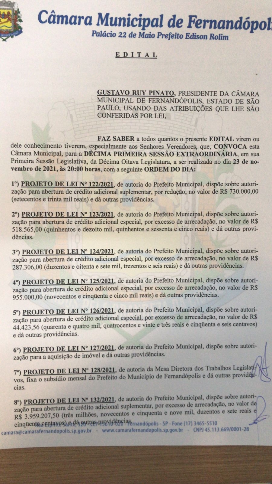 Pelo projeto, o salário do prefeito passará de R$ 17,8 mil para R$ 25 mil a partir de 1º de janeiro de 2022, quando termina a proibição de correção salarial no serviço público por conta da pandemia da Covid-19. O projeto não inclui correção nos salários do vice-prefeito, secretários e vereadores. A sessão está marcada às 20 horas. Veja abaixo a pauta da sessão extraordinária desta noite: