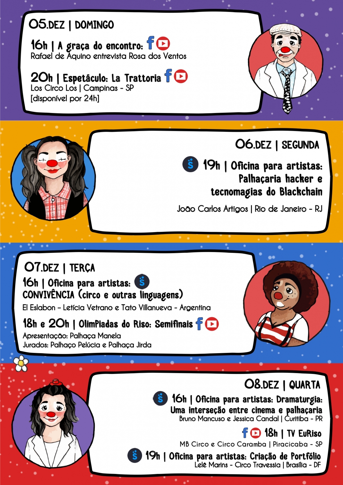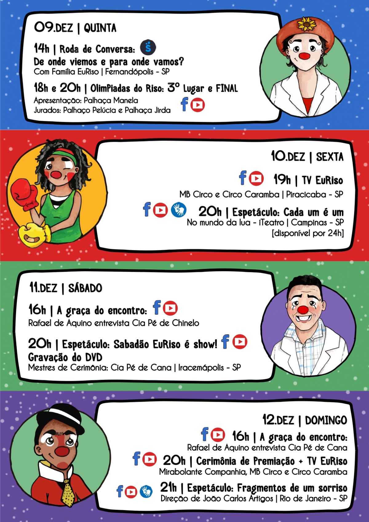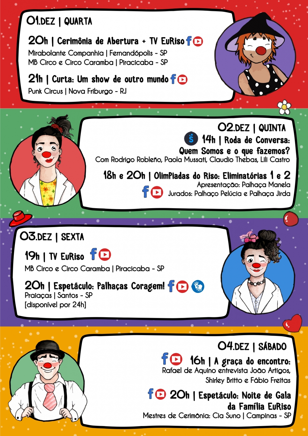 Começa nesta quarta-feira, 1º, mais uma versão virtual do EuRiso – Encontro Internacional de Palhaços”. Será a oitava edição de um dos maiores festivais de palhaços do Brasil e da América Latina.
