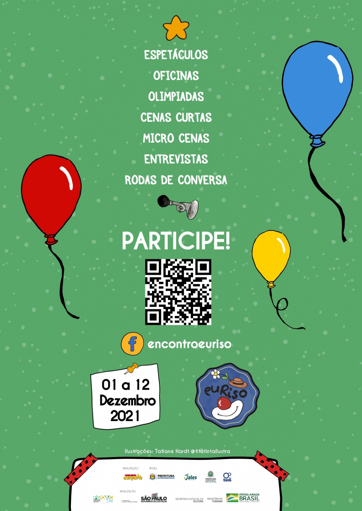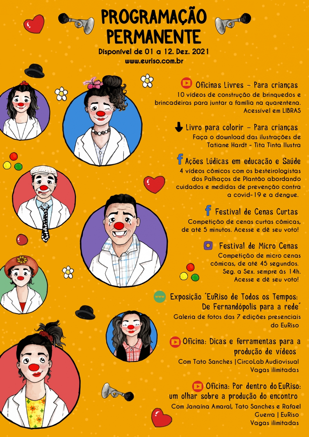 Como em edições anteriores, o encontro contará também com atividades permanentes, como oficinas livres, ilustrações para colorir disponíveis para download, ações lúdicas e educativas, Festival de Cenas Curtas, Festival de Micro Cenas, Exposição “EuRiso de Todos os Tempos: De Fernandópolis para a rede” (galeria de fotos das edições do encontro) e oficinas de produção voltadas para artistas.