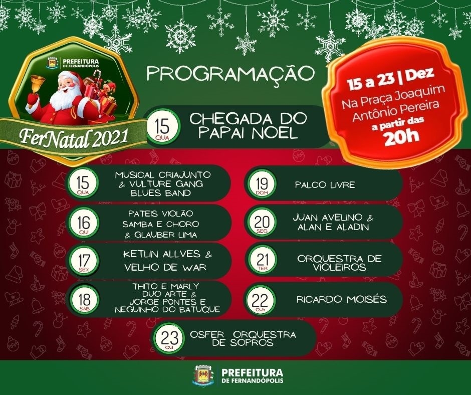 A prefeitura de Fernandópolis anunciou no final da tarde de ontem, 06, a programação oficial do ‘FerNatal’, a tradicional festa solidária que irá acontecer de 15 a 23 de dezembro, das 19h às 22h, na praça Joaquim Antônio Pereira.