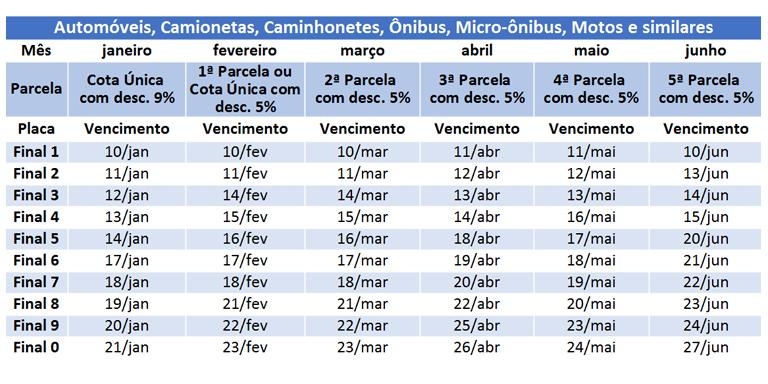Para quem optar por pagar o tributo integralmente em fevereiro, ou preferirem parcelar, a redução será de 5%. Ainda será possível parcelar o tributo em cinco vezes — nos últimos anos, era possível dividir o pagamento do imposto em três parcelas.