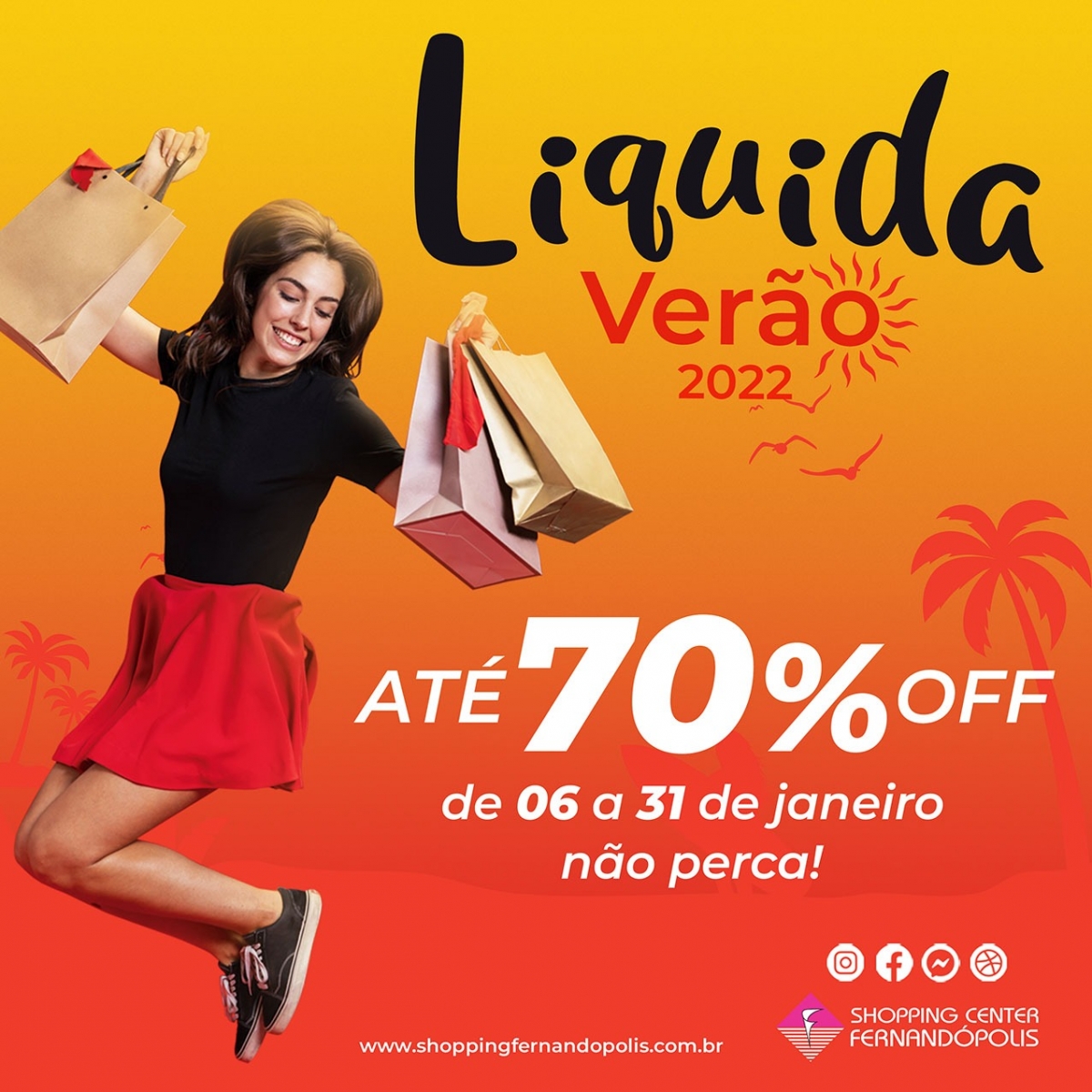 O Shopping Center Fernandópolis realiza sua grande liquidação entre os dias 06 e 31 de janeiro com descontos de até 70%. O Liquida Verão é a maior e mais tradicional promoção do Shopping.