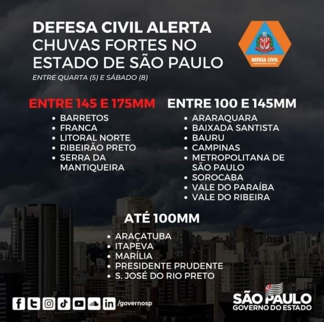 A Defesa Civil do Estado divulgou alerta para a região de Rio Preto, que inclui Fernandópolis, de chuvas intensas nos próximos dias. A previsão é de registro de até 100 mm.