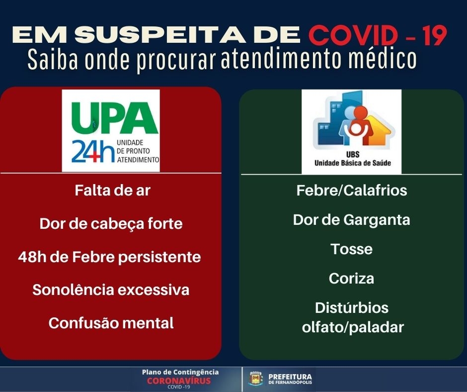 A secretaria de saúde de Fernandópolis divulgou no final da tarde de ontem um guia para orientar a população de quando procurar atendimento na UPA – Unidade de Pronto Atendimento ou na UBS – Unidade Básica de Saúde.