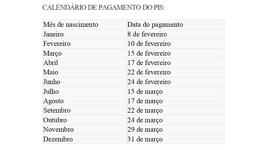Os pagamentos do PIS começam em fevereiro e referem-se ao ano-base de 2020. O calendário de recebimento do benefício considera o mês de nascimento para trabalhadores da iniciativa privada, e o número final da inscrição para servidores públicos.