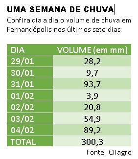 A chuva registrada em Fernandópolis em uma semana, é equivalente ao volume previsto para um mês inteiro. Dados da estação do Ciiagro – Centro Integrado de Informações Agrometeorológicas – mostra que no período de 29 de janeiro a 4 de fevereiro, a cidade registrou acumulado de chuva de 303,3 milímetros (cada milímetro corresponde a um litro d´água por metro quadrado).