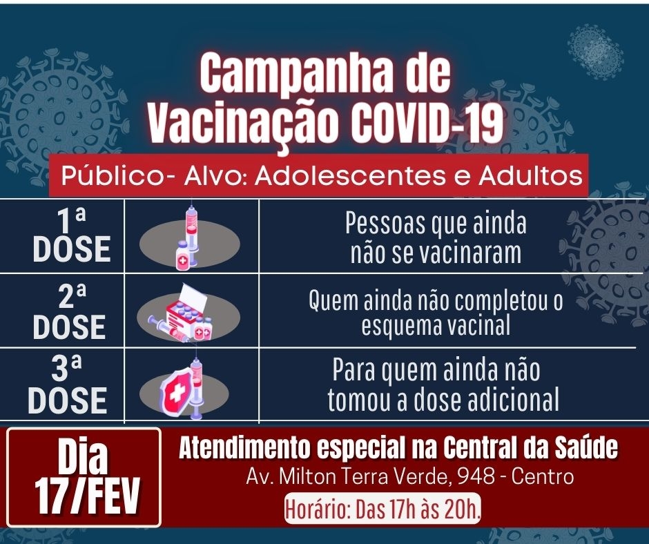Na oportunidade, serão imunizados adolescentes e adultos, sendo aplicadas: primeira dose para quem ainda não foi vacinado, segunda dose para os faltosos e a terceira dose para quem já estiver apto a tomar.