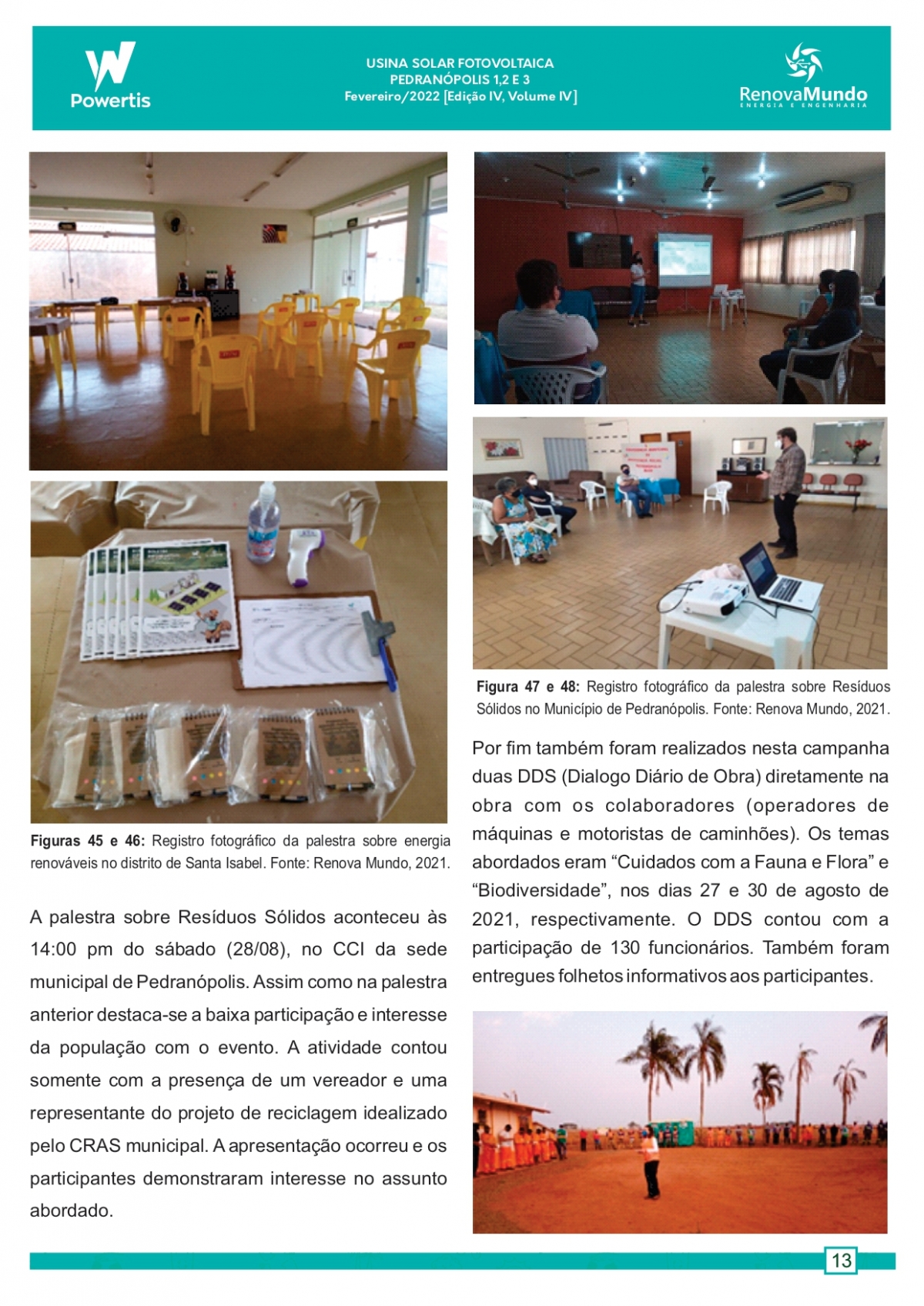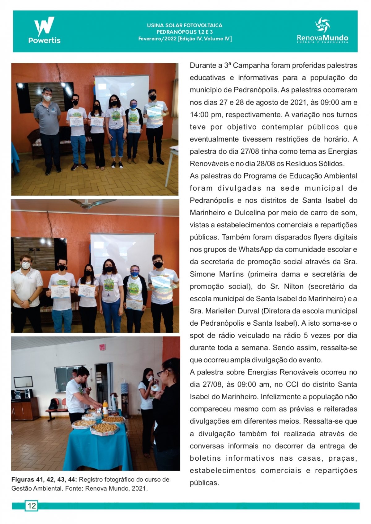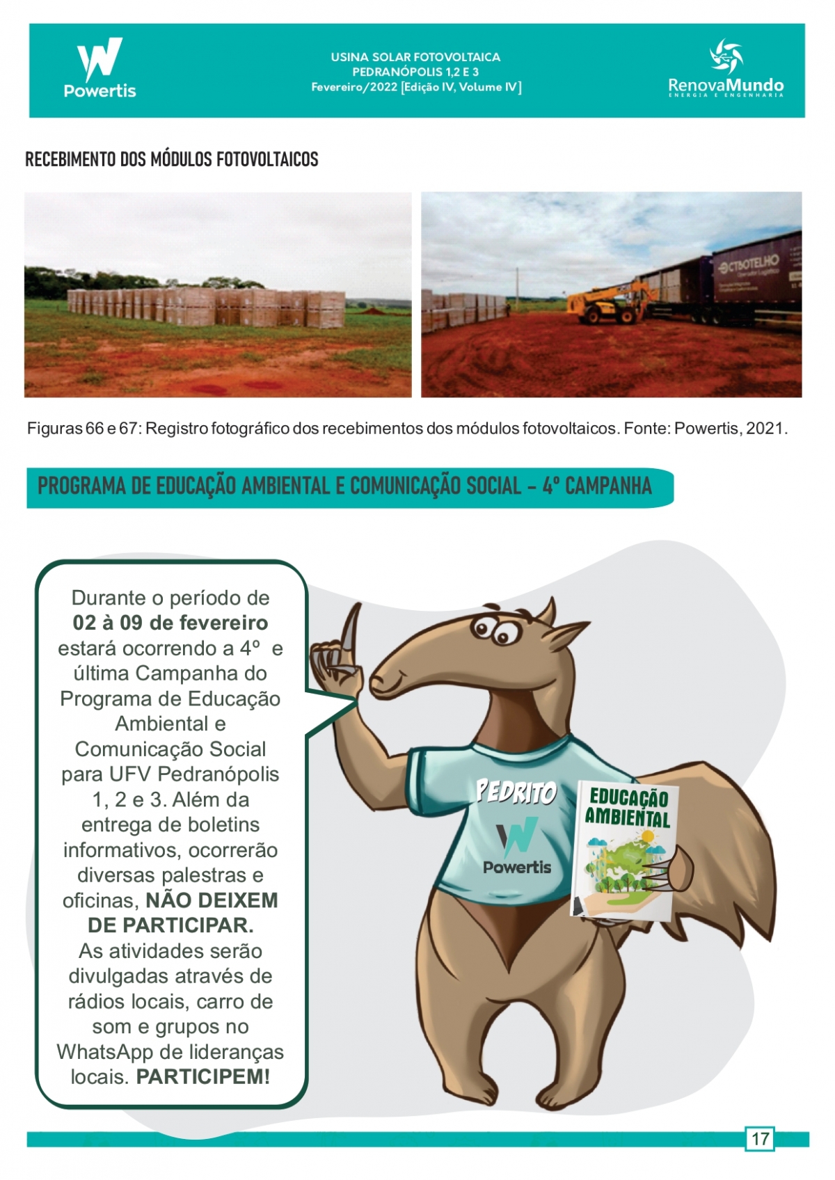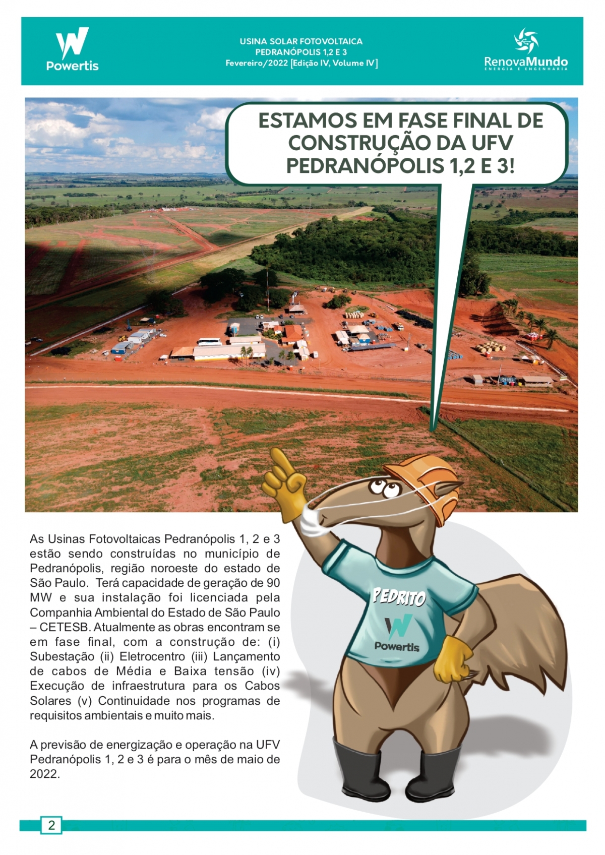 No período de 02 à 09 de fevereiro de 2022 a Renova Mundo Energia e Engenharia em parceria com a empresa POWERTIS realizou a última campanha (4º campanha) referente aos Programas de Educação Ambiental e Comunicação Social nas áreas de influência da USINA SOLAR FOTOVOLTAICA PEDRANÓPOLIS 1, 2 e 3 durante sua construção.