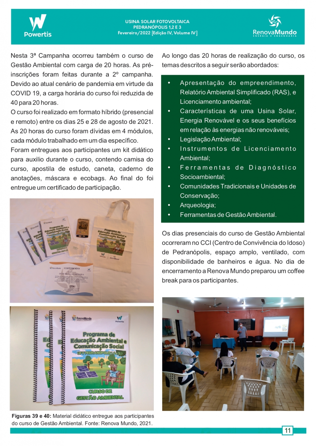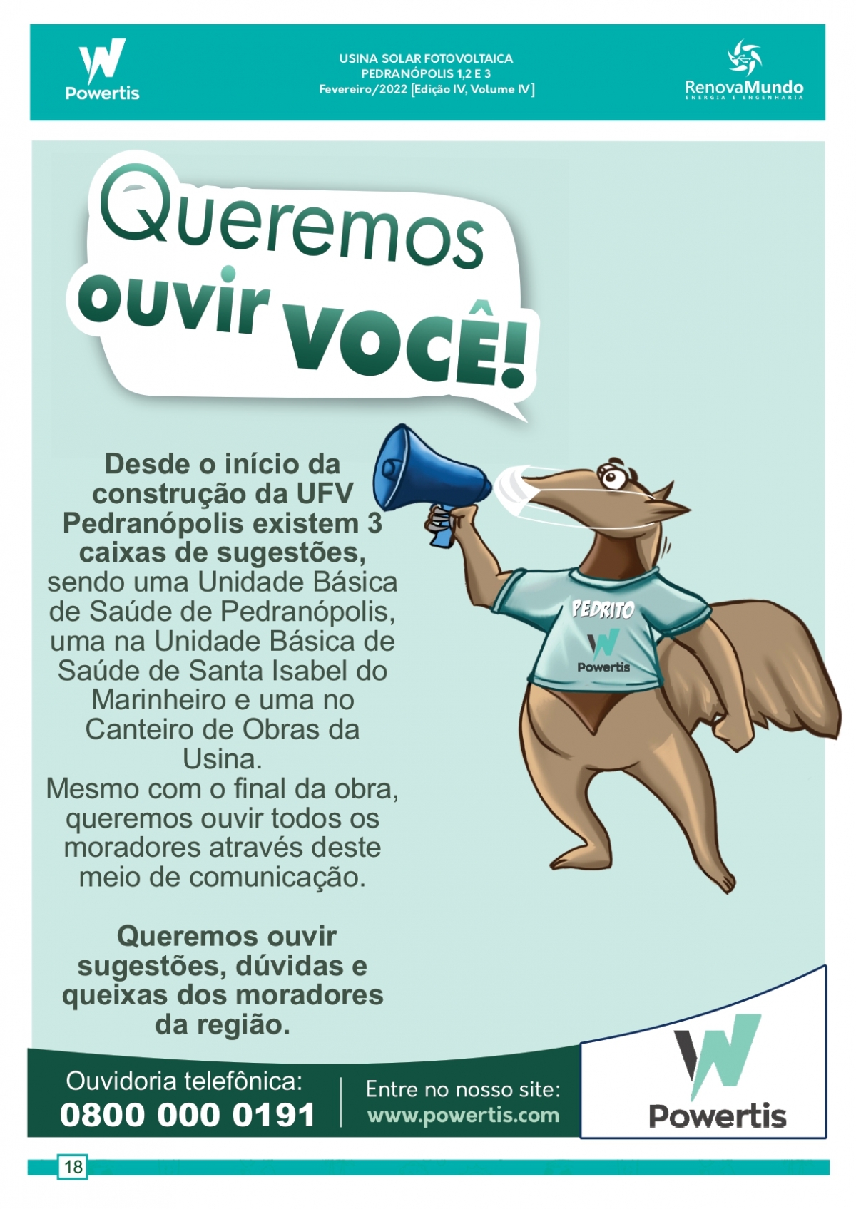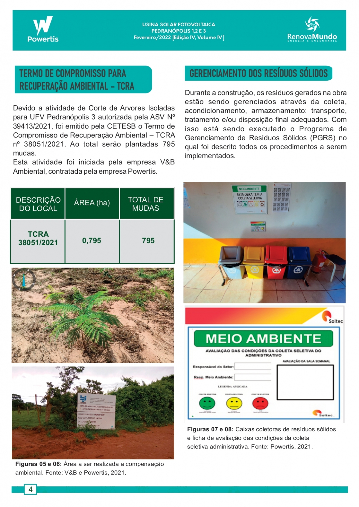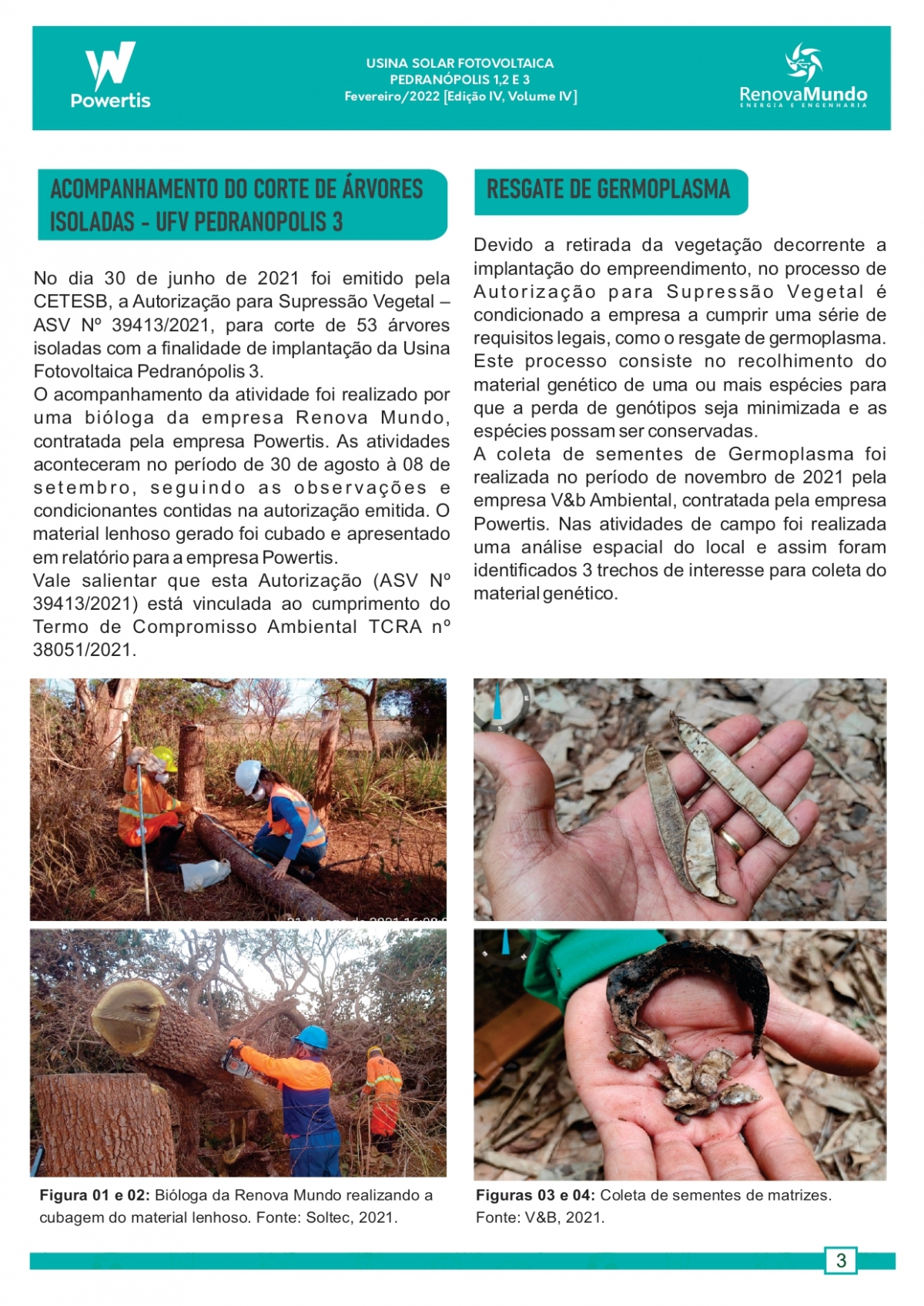 No período de 02 à 09 de fevereiro de 2022 a Renova Mundo Energia e Engenharia em parceria com a empresa POWERTIS realizou a última campanha (4º campanha) referente aos Programas de Educação Ambiental e Comunicação Social nas áreas de influência da USINA SOLAR FOTOVOLTAICA PEDRANÓPOLIS 1, 2 e 3 durante sua construção.