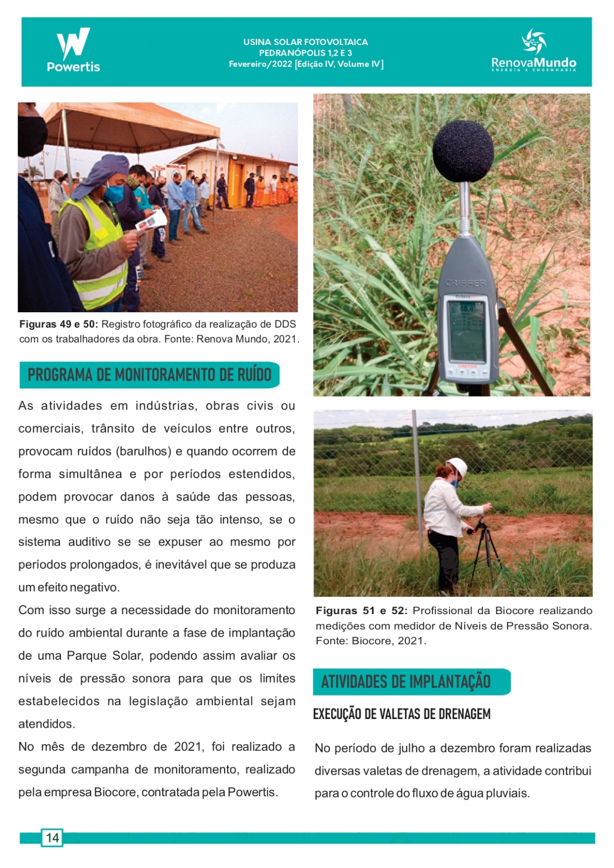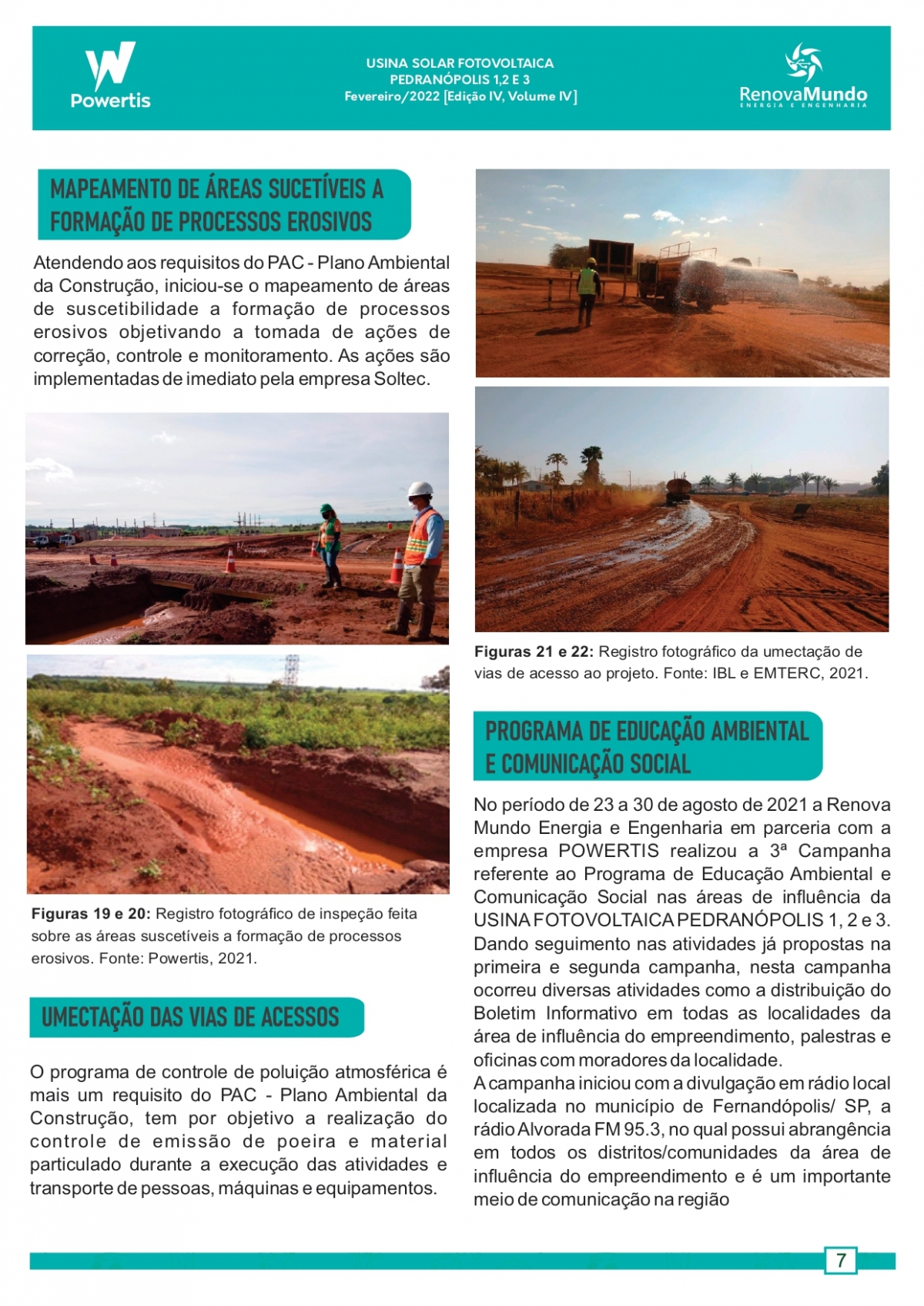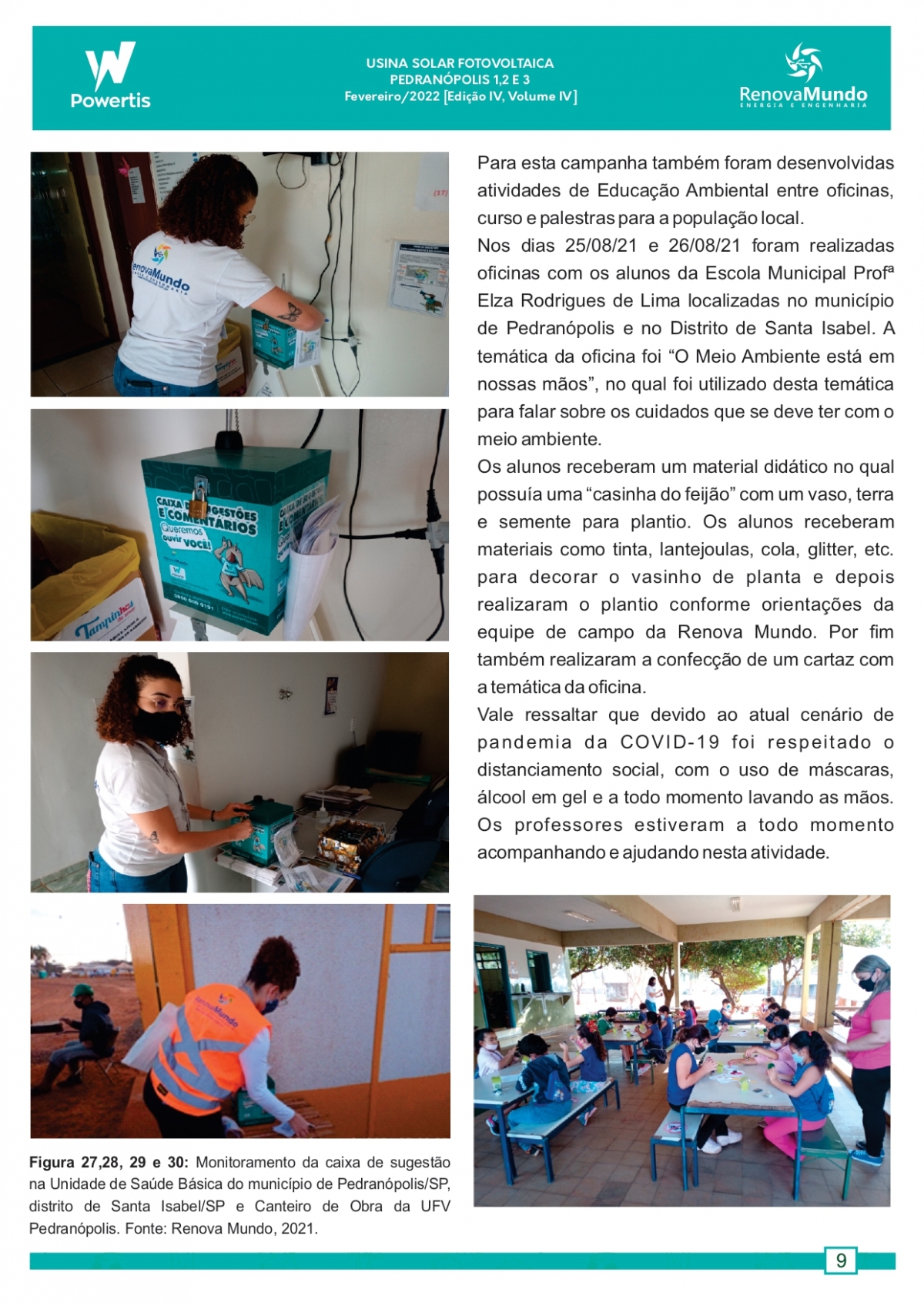 Cabe salientar que durante a fase de OPERAÇÃO das Usinas Fotovoltaicas Pedranópolis 1, 2 e 3 haverá ações anuais nas áreas de influência do empreendimento, com a entrega de boletim informativo para atualização das ações realizadas, e demais ações de Educação Ambiental e Comunicação Social.
