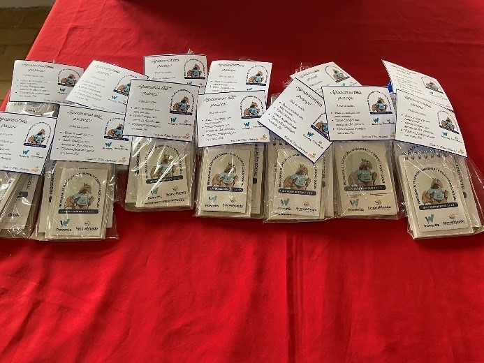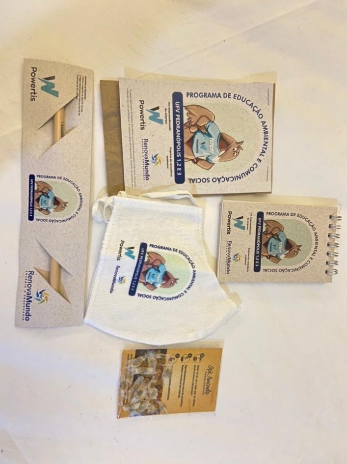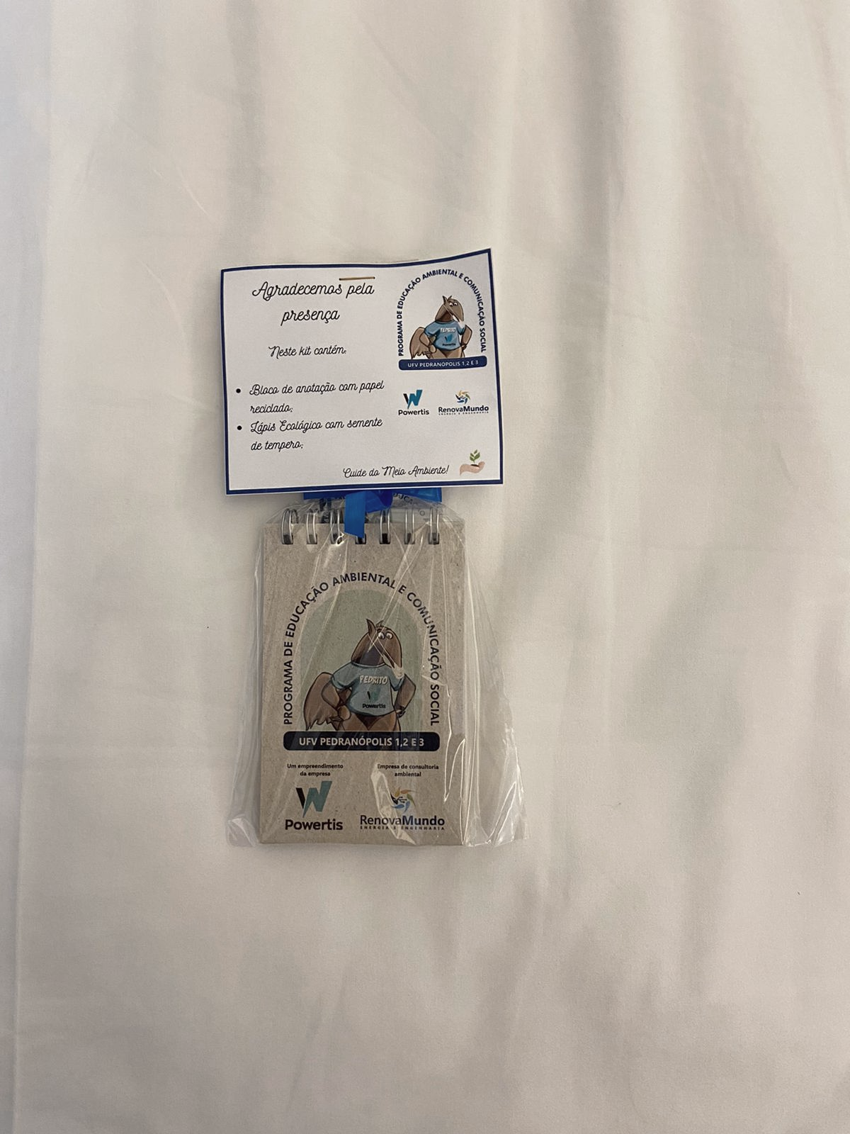 Foram entregues aos alunos brindes contendo uma caderneta feita de papel reciclado e um lápis contendo semente de hortaliça de manjericão para plantio em casa.