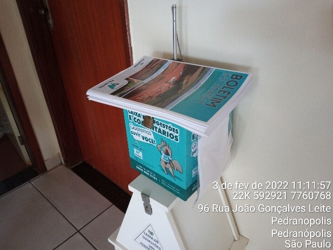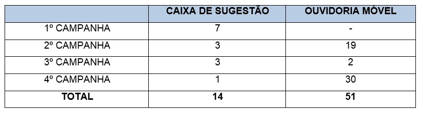 A caixa de sugestões foi outro canal de diálogo aberto com a comunidade e que continua em atividade. Eles permanecem em seus locais originais desde a 1ª Campanha – Unidade Básica de Saúde de Pedranópolis, Unidade Básica de Saúde de Santa Isabel do Marinheiro e o Canteiro de obras da Usina Solar. Esse espaço é para assegurar a comunicação entre a comunidade e a empresa – lá o morador pode escrever suas críticas, sugestões, dúvidas e/ solicitações de forma anônima ou não. As solicitações que se encontravam nas caixas foram recolhidas nessa campanha e repassadas para o responsável pelos retornos.