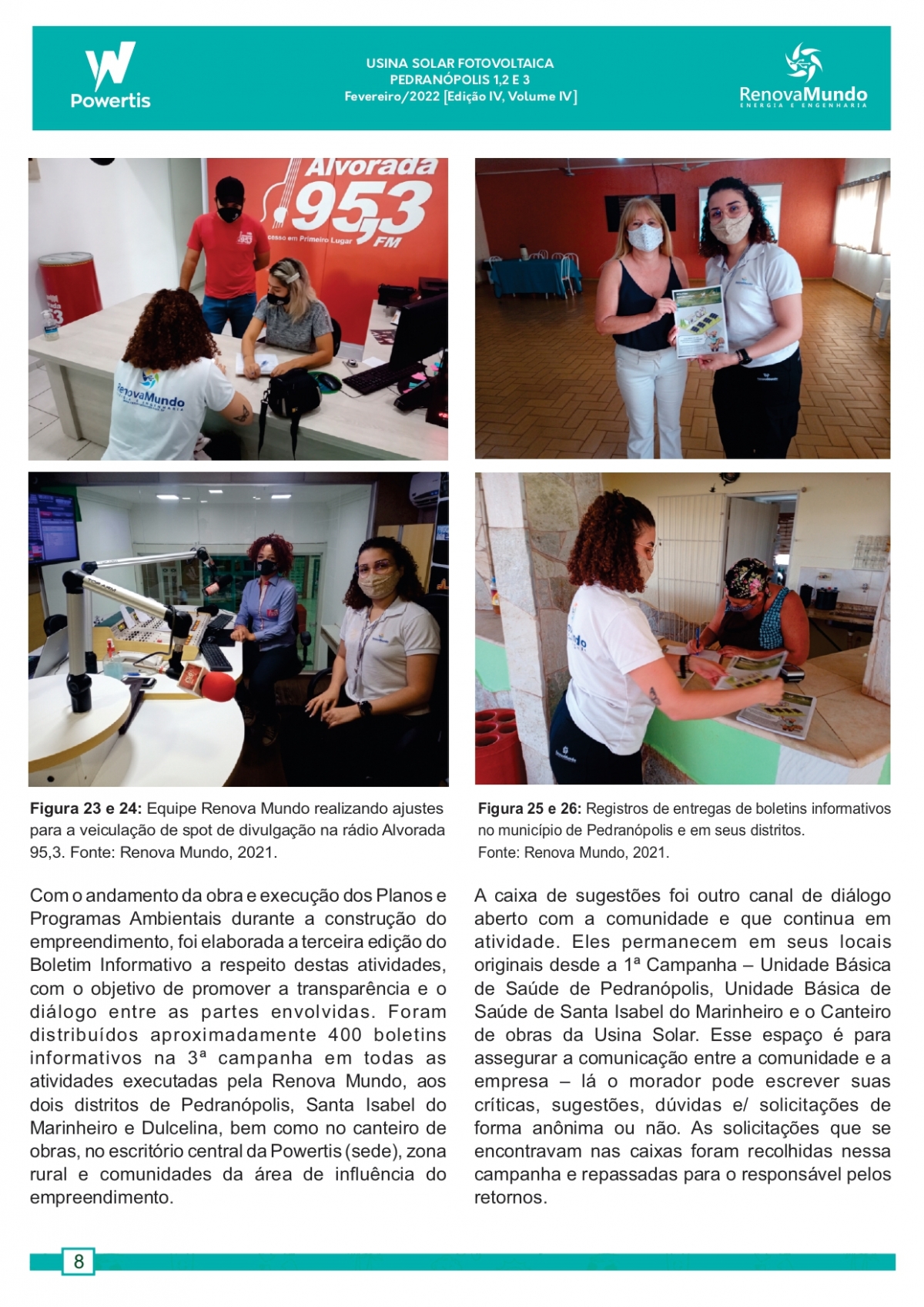 Com o andamento da obra e execução dos Planos e Programas Ambientais durante a construção do empreendimento, foi elaborada a terceira edição do Boletim Informativo (ANEXO) a respeito destas atividades, com o objetivo de promover a transparência e o diálogo entre as partes envolvidas. Foram distribuídos aproximadamente 400 boletins informativos na 4ª campanha em todas as atividades executadas pela Renova Mundo, aos dois distritos de Pedranópolis, Santa Isabel do Marinheiro e Dulcelina, bem como no canteiro de obras, no escritório central da Powertis (sede), zona rural e comunidades da área de influência do empreendimento. O material elaborado apresenta linguagem acessível, registros imagéticos seguindo o layout gráfico das campanhas prévias. Segue abaixo alguns registros de entregas de boletins informativos as comunidades locais.