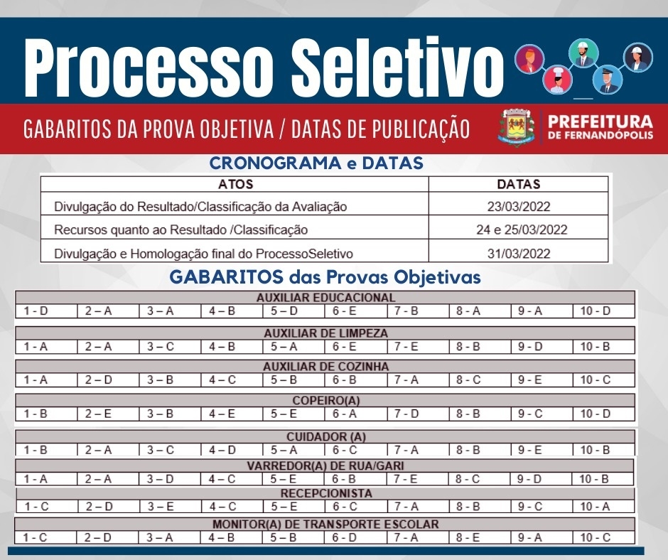 A Prefeitura de Fernandópolis divulgou nesta tarde o gabarito oficial das provas do processo seletivo realizado no último final de semana que para contratação emergencial de 297 trabalhadores (veja abaixo). De acordo com a prefeitura, 3,7 mil se inscreveram no concurso. Ainda não foi divulgado número de pessoas que deixaram de fazer a prova objetiva e nem quando sai a lista dos aprovados. As vagas abertas são para recepcionista, auxiliar educacional, cuidador de idoso, auxiliar de cozinha, monitor de transporte escolar, copeira, auxiliar de cozinha e varredor de rua/gari, além de tratorista.