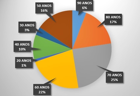 Levantamento realizado por CIDADÃO, com base nos boletins epidemiológicos divulgados pela Secretaria Municipal de Saúde, constatou que das mais de 380 mortes por Covid, quase metade dos óbitos registrados ocorreu na faixa etária entre 60 (22%) e 70 anos (25%), seguido depois por 80 anos (17%), 50 anos (16%), 40 anos (10%), 90 anos (6%). Os menores índices ficaram nas faixas de 30 (3%) e 20 anos (1%).