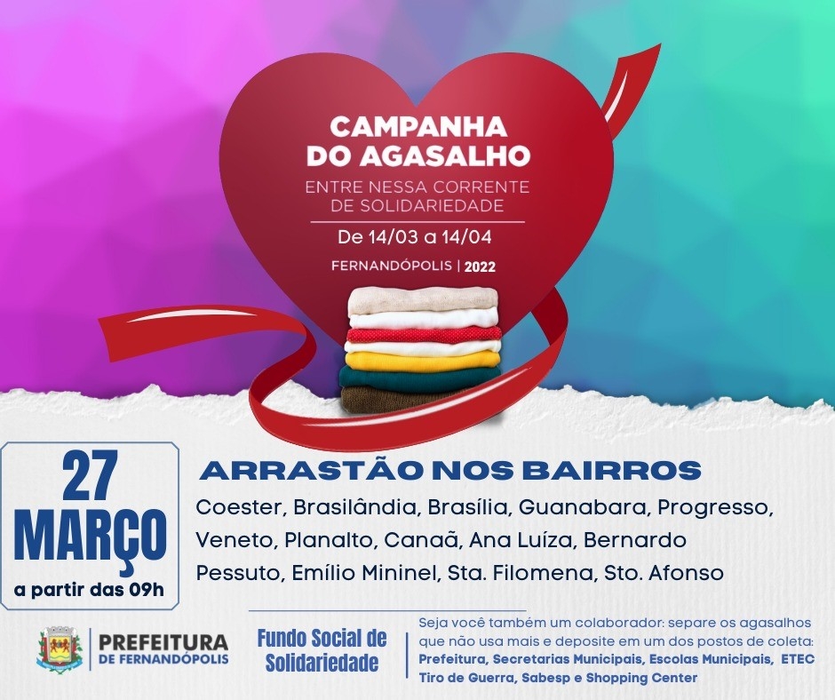 A Prefeitura de Fernandópolis, por meio do Fundo Social de Solidariedade e Secretaria Municipal de Assistência Social, realiza no próximo domingo, 27, o primeiro arrastão da Campanha do Agasalho 2022. Os voluntários irão percorrer diversos bairros da cidade em busca das doações de roupas, agasalhos e cobertores, a partir das 9h.