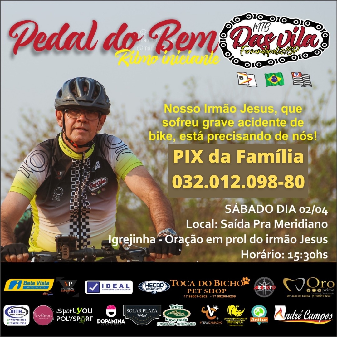 O grupo de ciclistas MTB das Vila realiza no próximo sábado, 02, um o ‘Pedal do Bem’ em prol do amigo e companheiro do esporte, Jesus Márcio do Carmo, que sofreu um acidente durante o circuito de uma prova de ciclismo que estava sendo realizada em Monte Alto.