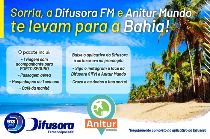 A rádio Difusora FM e a Anitur Mundo lançaram na manhã de ontem, 01, a promoção ‘Sorria, a Difusora FM e a Anitur Mundo te levam para a Bahia!’, que irá presentear um ouvinte com acompanhante com uma viagem para a cidade de Porto Seguro, na Bahia. Essa é a segunda grande promoção da rádio que, no mês de fevereiro, sorteou um iPhone 11 para a ouvinte Daniele Faria Zanini Garbim.