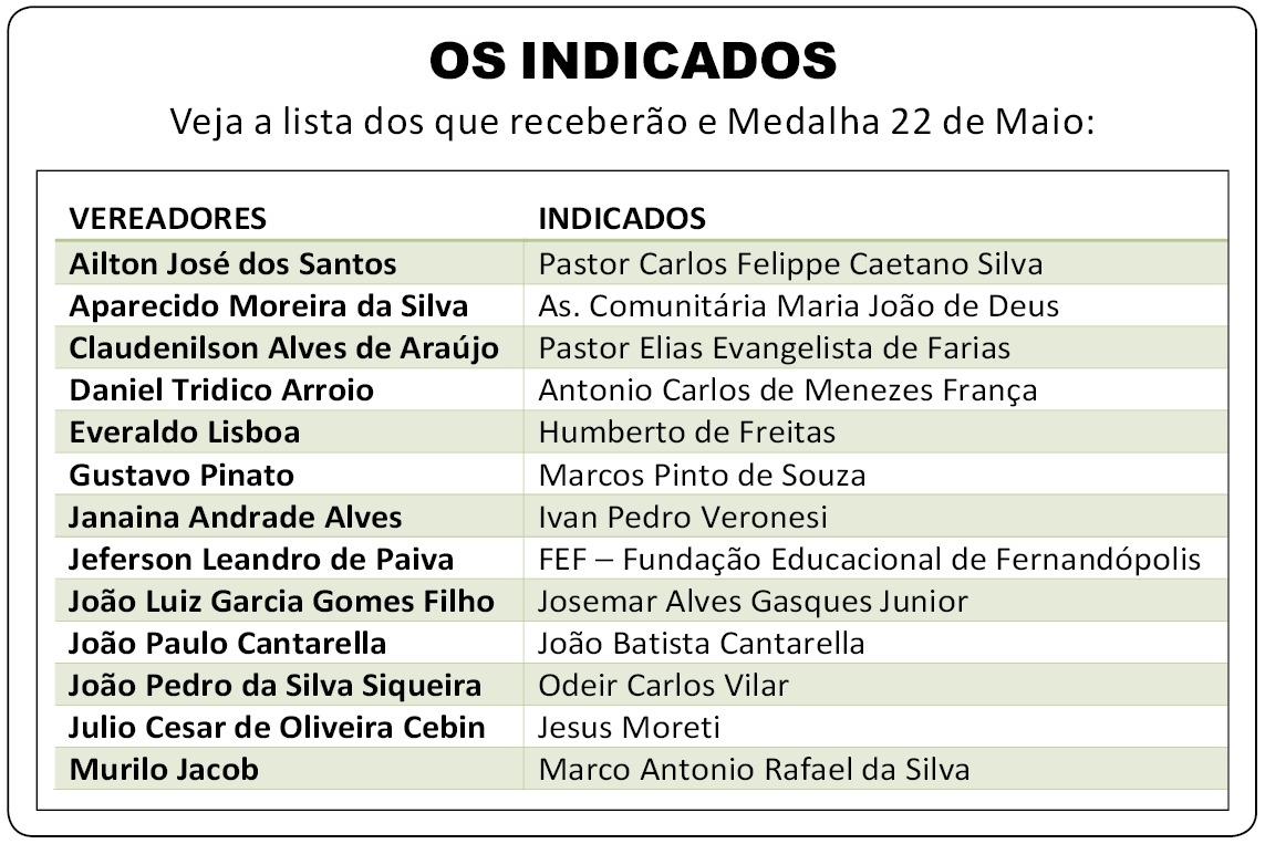 Os vereadores já apresentaram as indicações para as homenagens neste ano, inserindo como novidade, uma instituição (a Fundação Educacional de Fernandópolis) e uma entidade (Associação Comunitária Maria João de Deus) entre os que receberão a Medalha 22 de Maio.
