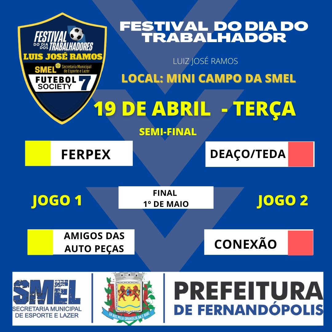 Hoje, 19, serão realizados os dois jogos válidos pelas semifinais do Festival dos Trabalhadores 2022. As disputas acontecem no minicampo da Secretaria Municipal de Esportes – SMEL, entre as equipes Ferpex X Amigos das Auto Peças e Deaço/Teda X Conexão. As partidas são realizadas a partir das 19h30.