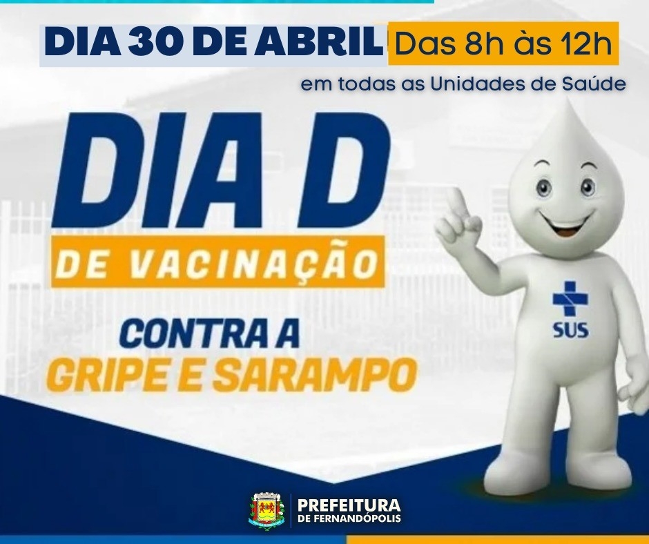 A Prefeitura de Fernandópolis, por meio da Secretaria Municipal da Saúde, realiza no próximo sábado, dia 30, o ‘Dia D’ da Vacinação contra a Gripe e o Sarampo. Todas as unidades de saúde estarão abertas das 08h às 12h.