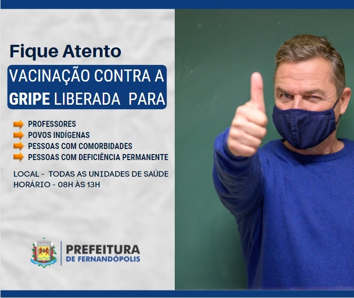 Desde ontem, a Secretaria Municipal de Saúde começou a imunizar contra a influenza (gripe) professores, indígenas, pessoas portadoras de deficiência e com comorbidades. As vacinas podem ser aplicadas em qualquer unidade de saúde do município, das 08h às 13h.