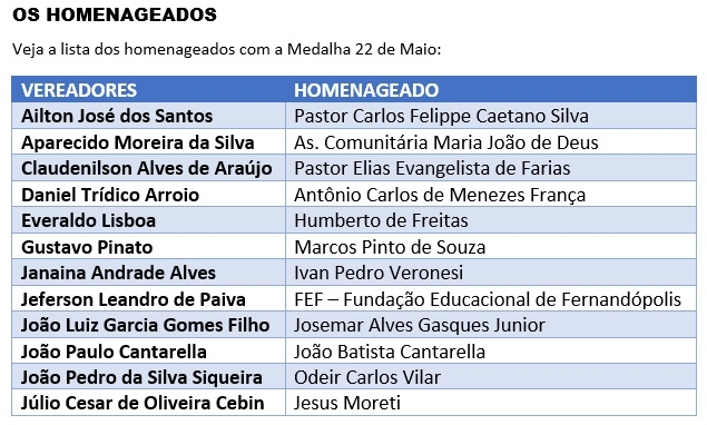 Os vereadores já apresentaram as indicações para as homenagens neste ano, inserindo como novidade, uma instituição (a Fundação Educacional de Fernandópolis) e uma entidade (Associação Comunitária Maria João de Deus) entre os que receberão a Medalha 22 de Maio.
