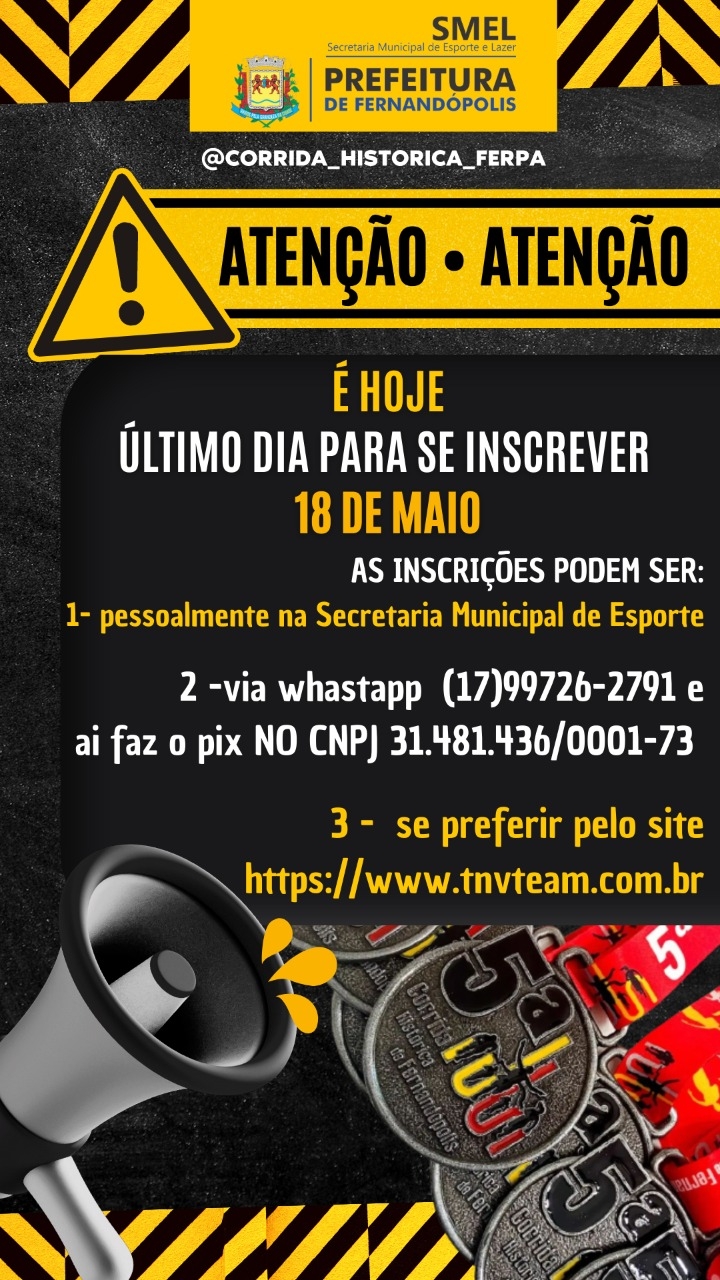 As inscrições para a 5ª edição da “Corrida Histórica de Fernandópolis” terminam hoje, 18. De acordo com a organização, até o momento já são 280 inscritos. A meta é atingir 350 corredores.
