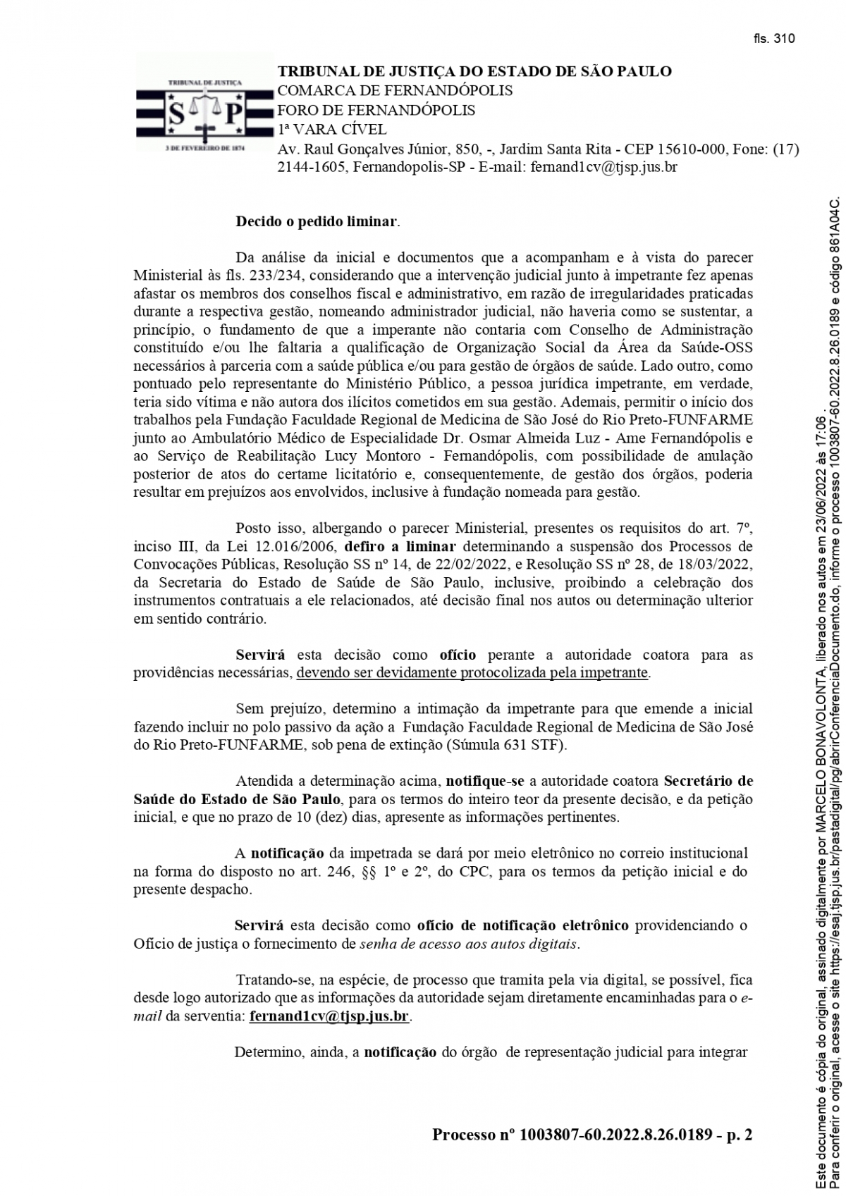 O juiz da 1ª Vara Civel de Fernandópolis Marcelo Bonavolonta concedeu liminar para suspender o ato da Secretaria Estadual da Saúde que outorgou a concessão da gestão do AME – Ambulatório Médico de Especialidades Dr. Osmar Almeida Luz e a Unidade de Reabilitação Lucy Montoro para Funfarme – Fundação Faculdade Regional de Medicina – que administra entre outras unidades o Hospital de Base.