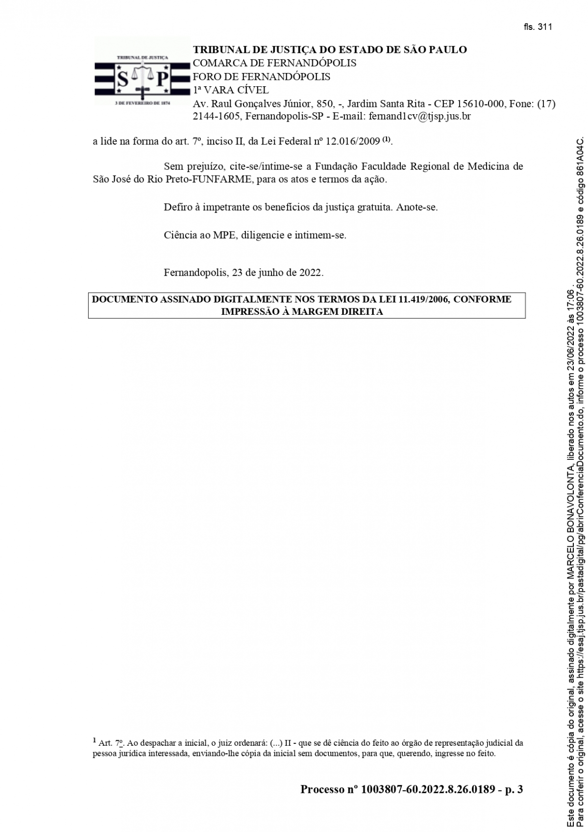 A medida atende recurso da Santa Casa de Fernandópolis.