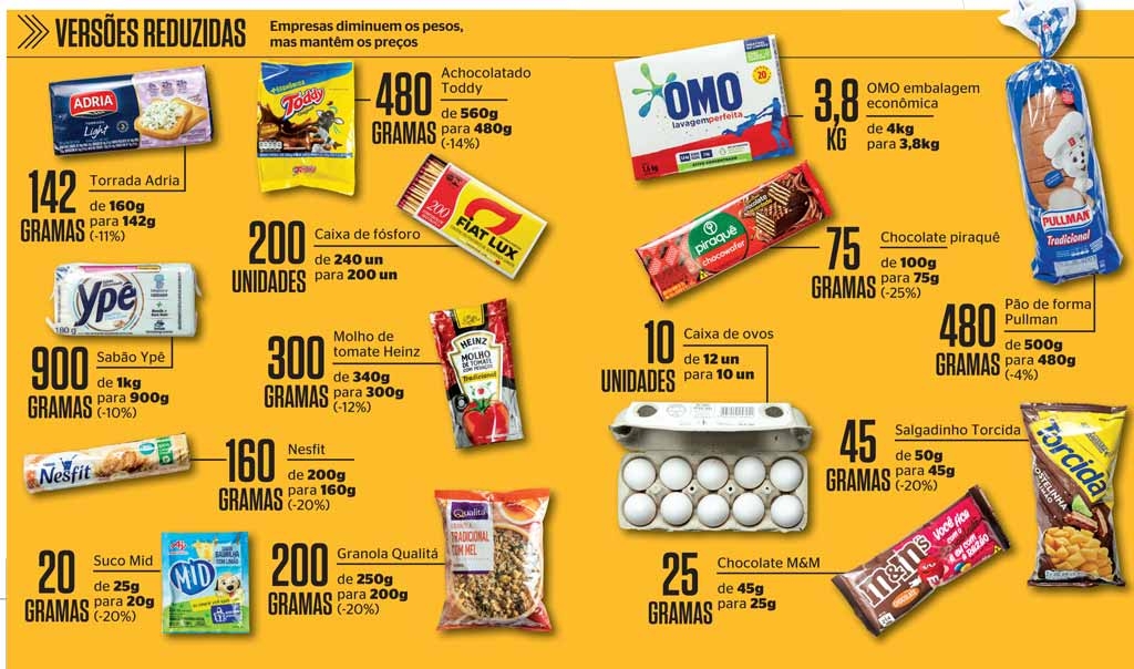 Cada vez mais empresas estão recorrendo à redução do tamanho das embalagens e à mudança na composição dos produtos para repassar o aumento de custos ao consumidor final, observa o Instituto Brasileiro de Defesa do Consumidor (Idec).