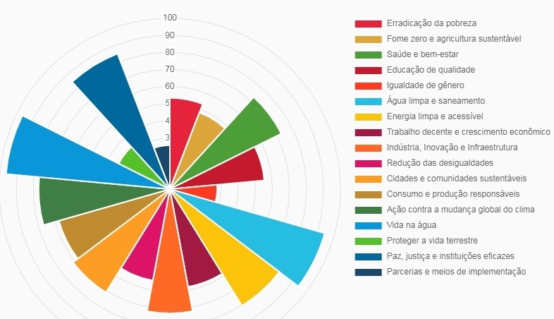 Com índice “alto” aparecem: Ações Contra Mudanças Globais do Clima (76,98), Saúde e Bem-Estar (72,96), Industria, Inovação e Infraestrutura (72,71), Cidades e Comunidades Sustentáveis (71,13), Consumo e Produção Responsável (67,66).