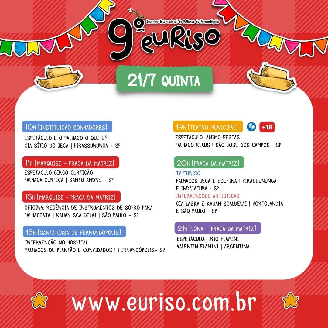 Já às 19, o Teatro Municipal recebe o espetáculo para maiores 18 anos “Animo Festas”, que será apresentado pelo Palhaço Klaus, que contará com acessibilidade em LIBRAS. Na Praça da Matriz, as atrações começam às 20h, com o Palhaço Jeca e a Palhaça Edufina comandando a TV EuRiso, acompanhados pela Cia Laska e Kauan Scandelai que farão intervenções junto ao público presente.