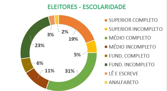 Os dados do eleitorado de Fernandópolis mostram que a migração de eleitores na faixa de instrução continua, agora, menos acelerado. Veja o exemplo: em 2016, o número de eleitores com curso superior completo era de 2.661. Este ano são 10.589, ou seja, um crescimento de 297%. O dado atual comparado com a eleição de 2020, o crescimento foi de apenas 1,27%. O maior deslocamento de eleitores na faixa de instrução ocorreu da eleição de 2016 para 2018 (salto de 72%) e para 2020 (mais 66%). Houve movimentação positiva também no ensino médio. Saiu de 9.948 em 2016 para 16.588 este ano, aumento de 66%. O número de eleitores analfabetos caiu 21,2% (de 1.240 em 2016 para 976 este ano).