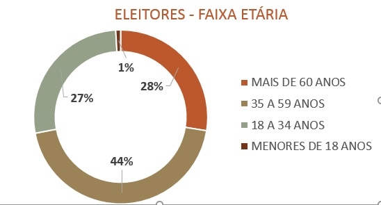 A parcela do eleitorado mais idoso também registrou aumento com relação à última eleição geral. Hoje os eleitores acima de 60 anos representam 28% do eleitorado apto ao voto (14.953). Mas, o grupamento de eleitores está concentrado na faixa entre 35 anos e 59 anos (24.150). Os que estão na faixa de 18 a 34 anos são 14.803 e os menores de 18 anos somam 489. O voto é obrigatório para quem tem entre 18 anos e 70 anos.