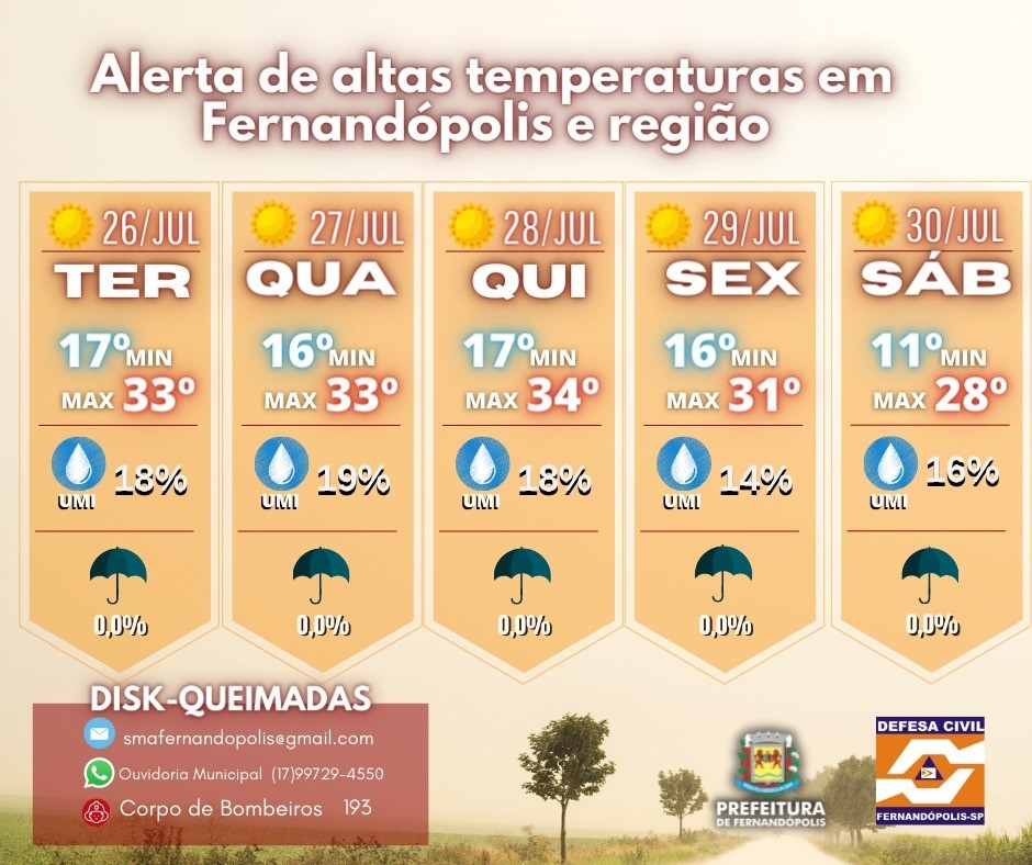 Quando a umidade chega aos 12% já é considerado estado de emergência. No decorrer desta semana em Fernandópolis é esperado que o nível aproxime-se dessa porcentagem. Hoje, 27, a umidade deve ficar na casa dos 19%, amanhã, 28, dos 18%, já na sexta-feira, 29, o índice deve ficar em 14% e no sábado, 30, a umidade se aproxima ao nível dos 16%, sem previsão de chuva.